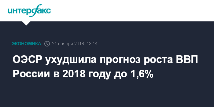 Москва. 21 ноября. INTERFAX.RU - Организация экономического сотрудничества и развития (ОЭСР) понизила прогноз роста экономики России по итогам 2018 года и сохранила прогноз на 2019 год.