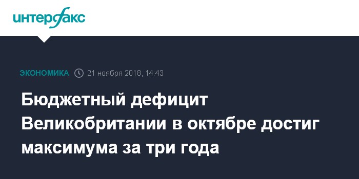 Москва. 21 ноября. INTERFAX.RU - Бюджетный дефицит Великобритании вырос в октябре до максимума за три года для этого месяца, поскольку госрасходы подскочили на 7,7% - самыми быстрыми темпами для октября за последние 11 лет, свидетельствуют данные Национального статистического управления (ONS).