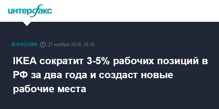 "В результате разработки и внедрения новой структуры в розничной сети ИКЕА в России в течение последующих двух лет могут быть упразднены около 3-5% позиций. В то же время мы ожидаем появление новых позиций, соответствующих требованиям рынка и планам развития компании", - говорится в сообщении группы Ingka, владельца бренда.