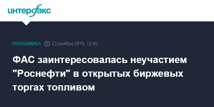 Москва. 22 ноября. INTERFAX.RU - Федеральная антимонопольная службы (ФАС) рассматривает ситуацию с неучастием "Роснефти" в открытых биржевых торгах топливом, решения пока не приняты. Об этом сообщил журналистам заместитель главы ведомства Анатолий Голомолзин.