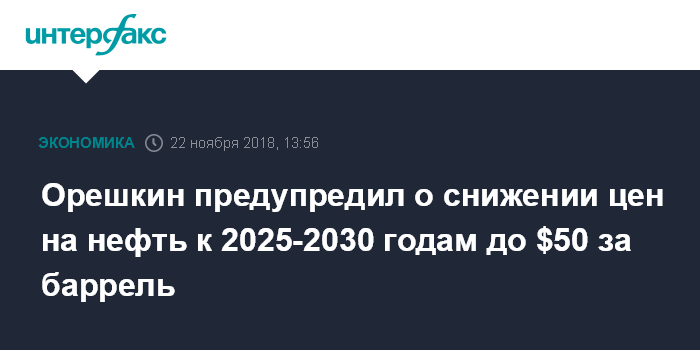 Москва. 22 ноября. INTERFAX.RU - Цены на нефть в долгосрочной перспективе серьезно снизятся - примерно до $50 к 2025-2030 годам и далее будут находиться примерно на этом уровне в реальном выражении, сказал глава Минэкономразвития РФ Максим Орешкин журналистам по итогам заседания правительства, на котором рассматривался долгосрочный макропрогноз до 2036 года.