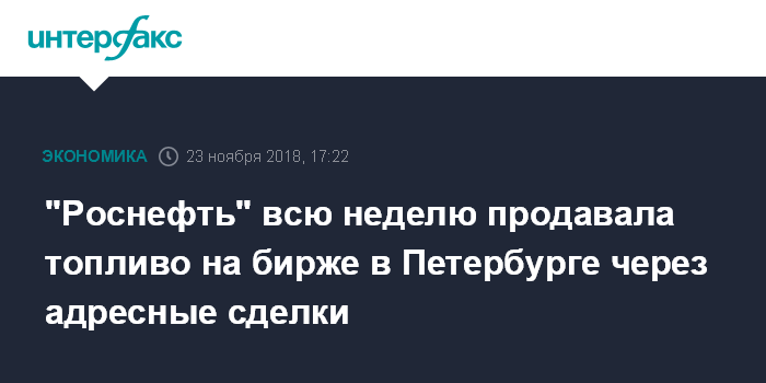 Москва. 23 ноября. INTERFAX.RU - "Роснефть" по итогам пятничных торгов на Санкт-Петербургской международной товарно-сырьевой бирже совершала только адресные сделки, сообщил "Интерфаксу" источник на топливном рынке.