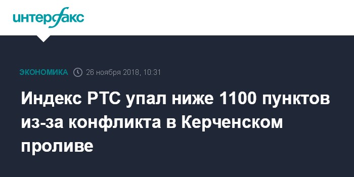 Москва. 26 ноября. INTERFAX.RU - Индекс РТС, один из основных российских фондовых индикаторов, утром в понедельник упал ниже отметки 1100 пунктов под давлением распродаж, спровоцированных эскалацией политического конфликта между Россией и Украиной из-за событий в Керченском проливе.