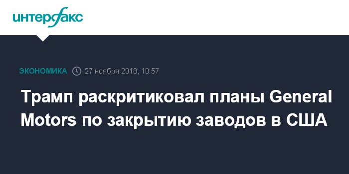 Москва. 27 ноября. INTERFAX.RU - Президент США Дональд Трамп резко отреагировал на планы General Motors (GM) закрыть пять заводов на территории Северной Америки и уволить порядка 10 тысяч сотрудников в регионе, сообщает CNN.
