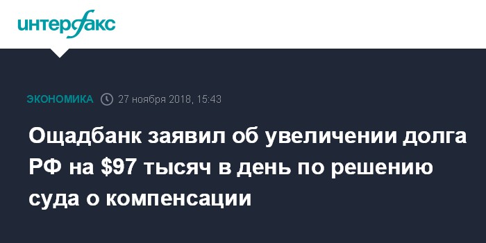 Москва. 27 ноября. INTERFAX.RU - Долг Российской Федерации по иску Ощадбанка (Киев) о компенсации убытков учреждения в связи с утраченными в Крыму инвестициями будет ежедневно расти на $97 тысяч, сообщил глава правления Ощадбанка Андрей Пышный на своей странице в фейсбуке.