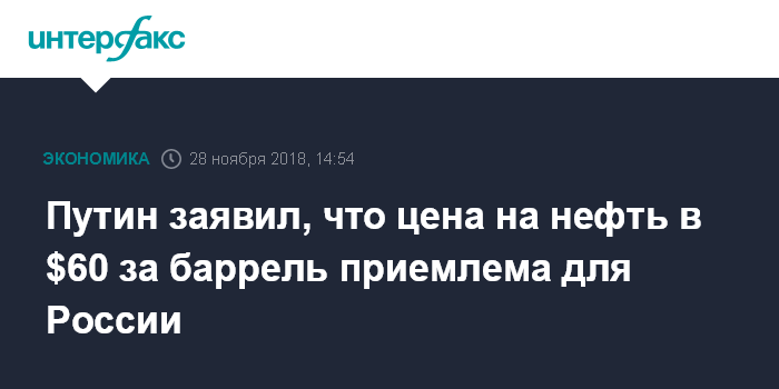 Москва. 28 ноября. INTERFAX.RU - Цена на нефть остается приемлемой для России, несмотря на снижение до $60 за баррель, сказал президент России Владимир Путин.