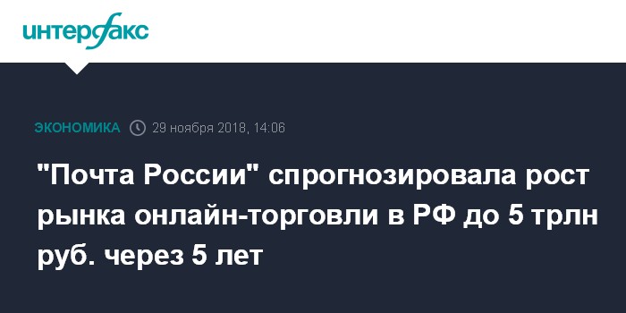 Москва. 29 ноября. INTERFAX.RU - Российский рынок онлайн-торговли вырастет минимум до 5 трлн рублей за пять лет, прогнозирует гендиректор "Почты России" Николай Подгузов.