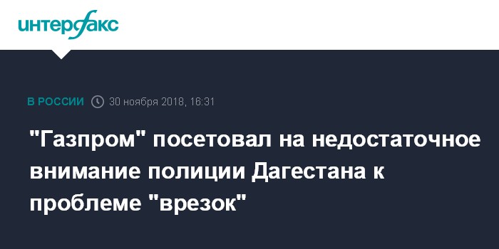 Москва. 30 ноября. INTERFAX.RU - "Газпром" отмечает, что правоохранительные органы Республики Дагестан реагируют только на каждое седьмое обращение компании на незаконные подключения к газовым сетям.