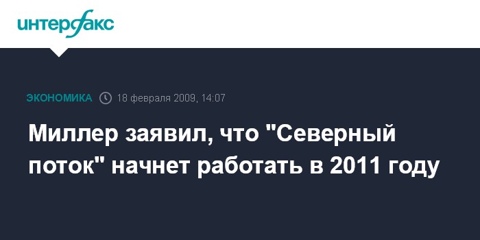 Москва. 18 февраля. INTERFAX.RU - Глава "Газпрома" Алексей Миллер заявил, что "Северный поток" будет построен и заработает в 2011 году. "Сейчас проведены необходимые исследования и согласования по газопроводу "Северный поток", начата работа по производству труб", - сообщил Миллер.