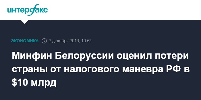 Москва. 2 декабря. INTERFAX.RU - Белоруссия в течение шести лет может потерять около $10 млрд из-за реализации механизма налогового маневра в России в случае непринятия компенсационных мер, в том числе от российской стороны, заявил заместитель министра финансов Андрей Белковец на форуме для иностранных инвесторов BelarusCrossway'18.