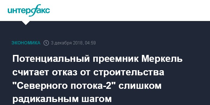 Москва. 3 декабря. INTERFAX.RU - Генеральный секретарь партии Ангелы Меркель и ее возможный преемник на посту канцлера ФРГ Аннегрет Крамп-Карренбауэр заявила, что предложения об отказе от строительства "Северного потока-2" являются чрезмерно жесткими.