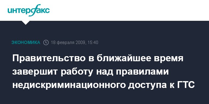 Москва. 18 февраля. INTERFAX.RU - Правительство в ближайшее время завершит работу над правилами недискриминационного доступа к газотранспортной системе (ГТС), сообщил журналистам вице-премьер РФ Игорь Сечин.