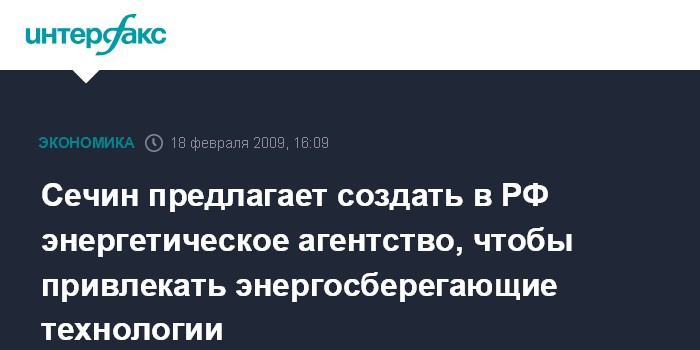 Москва. 18 февраля. INTERFAX.RU - Вице-премьер РФ Игорь Сечин выступил с инициативой создания Российского энергетического агентства для привлечения технологий энергосбережения.