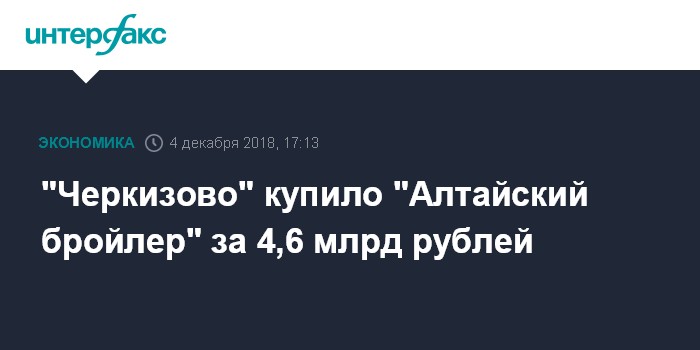 Москва. 4 декабря. INTERFAX.RU - Группа "Черкизово" , один из ведущих производителей мяса и мясной продукции в РФ, завершила сделку по покупке "Алтайского бройлера".