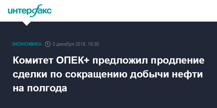 Москва. 5 декабря. INTERFAX.RU - Министерский мониторинговый комитет ОПЕК+ рекомендовал продлить действие соглашения об ограничении добычи нефти еще на полгода - до конца июня 2019 года, заявил журналистам министр нефти Омана Мохаммед Хамад аль-Румхи.