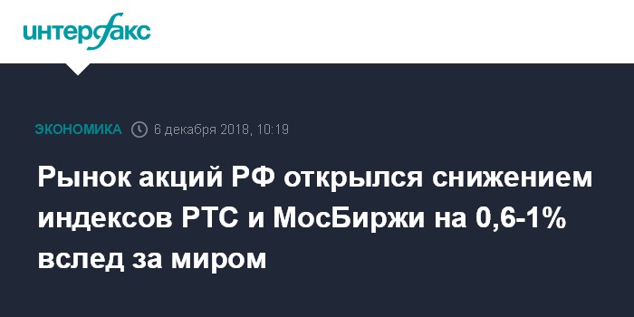 Москва. 6 декабря. INTERFAX.RU - Рынок акций РФ открылся в четверг падением цен blue chips на фоне ухудшения внешней фондовой конъюнктуры на опасениях по поводу успешности предстоящих торговых переговоров США и Китая в свете ареста финансового директора Huawei; индексы РТС и МосБиржи за минуту просели на 0,6-1%.