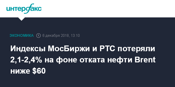 Индексы МосБиржи и РТС потеряли 2,1-2,4% на фоне отката нефти Brent ниже $60