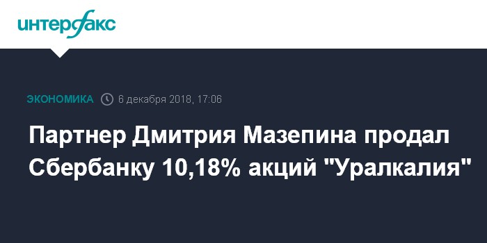 Партнер Дмитрия Мазепина продал Сбербанку 10,18% акций "Уралкалия"