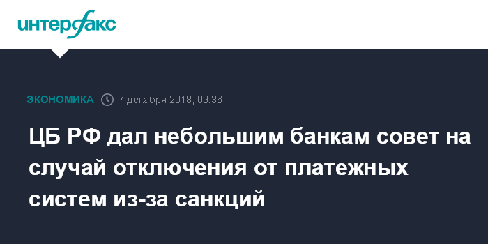 Москва. 7 декабря. INTERFAX.RU - ЦБ РФ рекомендовал небольшим банкам, работающим с платежными системами не напрямую, заключить договор с запасным банком-спонсором для платежных систем на случай введения санкций, пишет газета "Ведомости".