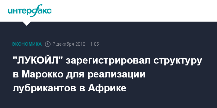 Москва. 7 декабря. INTERFAX.RU - ООО "ЛЛК-Интернешнл" (100% дочернее предприятие ПАО "ЛУКОЙЛ") зарегистрировало в Марокко компанию LUKOIL Lubricants Africa S.A.R.L., созданную для ведения бизнеса в государствах Западной и Северной Африки, говорится в сообщении общества.