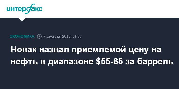 Москва. 7 декабря. INTERFAX.RU - Цена на нефть в диапазоне $55-65 за баррель приемлема как для производителей, так и для потребителей на мировом рынке, считает глава Минэнерго РФ Александр Новак в интервью "России 24".