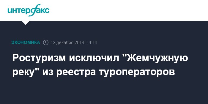 Москва. 12 декабря. INTERFAX.RU - Ростуризм в среду исключил из единого федерального реестра туроператоров два юрлица, работавших на рынке под брендом "Жемчужная река", из-за невозможности исполнения всех обязательств по договорам о реализации туристского продукта, следует из приказа, размещенного на сайте ведомства.