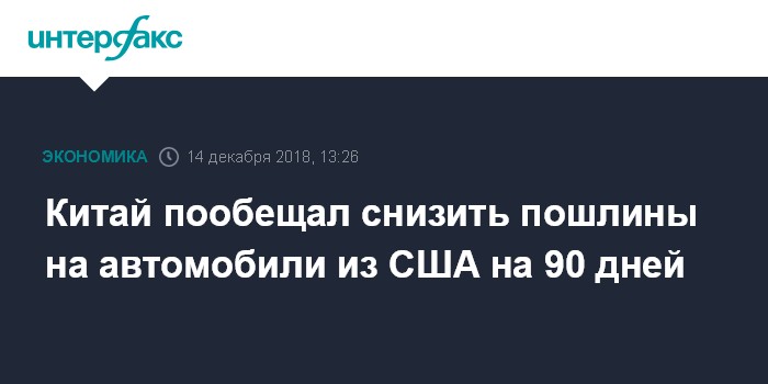 Москва. 14 декабря. INTERFAX.RU - Китай снизит штрафные ввозные пошлины на импортируемые из США автомобили на 90 дней, чтобы снизить напряженность в торговых отношениях с Вашингтоном.