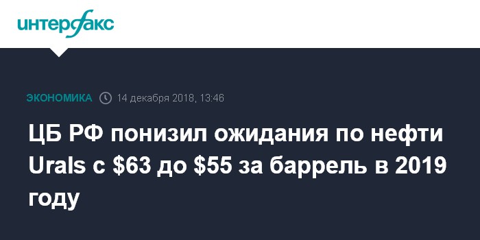ЦБ РФ понизил ожидания по нефти Urals с $63 до $55 за баррель в 2019 году