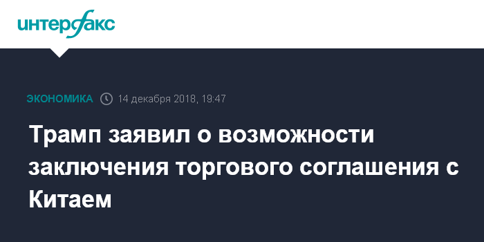 Москва. 14 декабря. INTERFAX.RU - Президент США Дональд Трамп в пятницу заявил, что США и Китай могут в скором времени заключить торговую сделку.