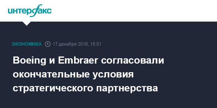 Москва. 17 декабря. INTERFAX.RU - Бразильский авиастроительный концерн Embraer SA объявил об окончательном согласовании условий стратегического партнерства с американской Boeing Co.