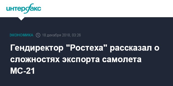 Москва. 18 декабря. INTERFAX.RU - Экспорт самолетов МС-21, на который "Ростех" делает большую ставку, может быть осложнен в случае, если Росавиации не удастся договориться о признании своей системы сертификации в Европе и США, заявил гендиректор "Ростеха" Сергей Чемезов в интервью газете "Ведомости", опубликованном во вторник.