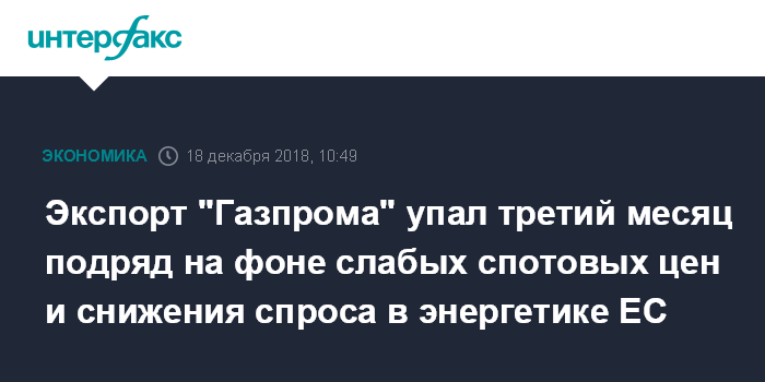 Москва. 18 декабря. INTERFAX.RU - Экспорт природного газа "Газпрома" в дальнее зарубежье падает третий месяц подряд на фоне снижения спотовых цен в Европе вразрез с продолжающимся ростом контрактных цен "Газпрома", мягкой погодой в Европе и снижением спроса на газ со стороны электроэнергетики.
