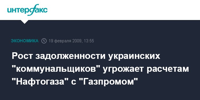 Москва. 19 февраля. INTERFAX.RU - Национальная акционерная компания (НАК) "Нафтогаз Украины" заявляет о возможном ухудшении ситуации по расчетам с ОАО "Газпром" в результате катастрофического роста задолженности предприятий коммунальной теплоэнергетики (ТКЭ) перед предприятиями НАК.