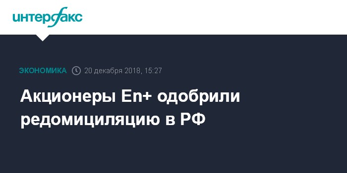 Москва. 20 декабря. INTERFAX.RU - Собрание акционеров En+ одобрило редомициляцию En+ с острова Джерси в Россию и меры в рамках реализации "плана Баркера", говорится в сообщении компании.