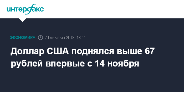 Москва. 20 декабря. INTERFAX.RU - Доллар США на Московской бирже ускорил рост в четверг вечером и поднялся выше 67 руб. впервые с 14 ноября.