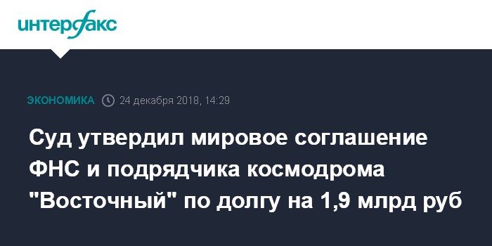 Суд утвердил мировое соглашение ФНС и подрядчика космодрома "Восточный" по долгу на 1,9 млрд руб