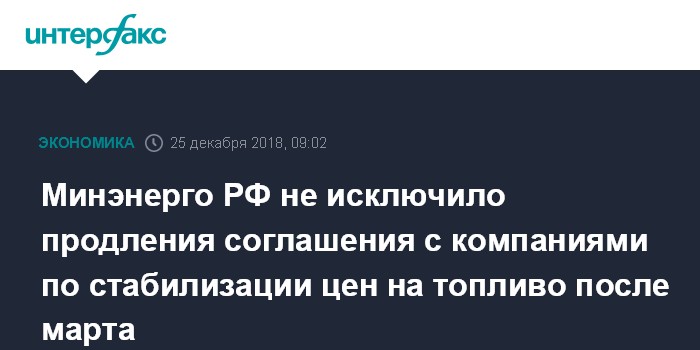 Москва. 25 декабря. INTERFAX.RU - Минэнерго РФ не исключает возможности продления соглашения с нефтяными компаниями о стабилизации цен на топливо на внутреннем рынке после 31 марта 2019 года, но надеется, что это не понадобится, заявил глава Минэнерго РФ Александр Новак в интервью газете "Коммерсантъ".