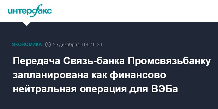 Передача Связь-банка Промсвязьбанку запланирована как финансово нейтральная операция для ВЭБа