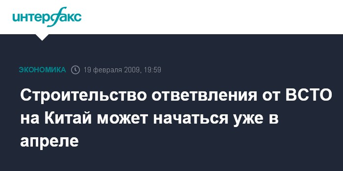 Сеул. 19 февраля. INTERFAX.RU - Строительство ответвления от нефтепровода Восточная Сибирь-Тихий океан (ВСТО) на Китай может начаться в апреле 2009 года, сообщил журналистам вице-премьер РФ Игорь Сечин.