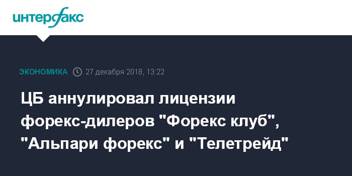 Москва. 27 декабря. INTERFAX.RU - ЦБ РФ аннулировал лицензии профучастника рынка ценных бумаг на осуществление деятельности форекс-дилера у пяти компаний: ООО "Форекс клуб", ООО "Фикс трейд", ООО "Трастфорекс", ООО "Телетрейд групп", ООО "Альпари форекс", следует из информации на сайте регулятора.