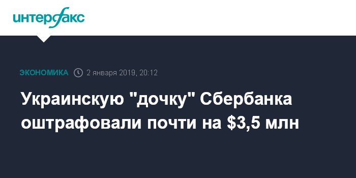 Москва. 2 января. INTERFAX.RU - Национальный банк Украины наложил штраф на Сбербанк (Киев), дочку одноименного российского госбанка, в размере 94,737 млн гривен ($3,42 млн по текущему курсу) за повторное совершение рисковой деятельности в сфере финансового мониторинга на общую сумму более 3 млрд грн.