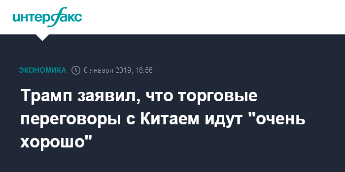 Москва. 8 января. INTERFAX.RU - Президент США Дональд Трамп выразил оптимизм в отношении проходящих в настоящее время торговых переговоров с Китаем.