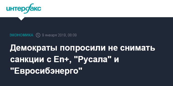 Москва. 9 января. INTERFAX.RU - Группа демократов, возглавляющих семь комитетов Палаты представителей Конгресса США, обратилась с письмом к Минфину США с просьбой отложить решение о смягчении санкций в отношении компаний Олега Дерипаски En+ , "РусАл" и "Евросибэнерго".