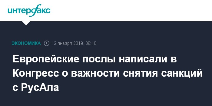 Москва. 12 января. INTERFAX.RU - Послы ряда европейских государств направили председателю комитета Конгресса США по внешней политике Элиоту Энджелу коллективное письмо, в котором говорится о важности снятия санкций с "РусАла" и его материнской компании En+.