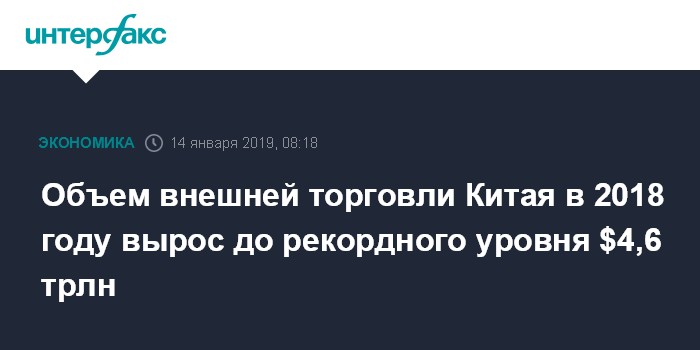 Москва. 14 января. INTERFAX.RU - Объем внешней торговли Китая в 2018 году достиг рекордной за всю историю отметки в $4,62 трлн, увеличившись по сравнению с 2017 годом на 12,6%, сообщил журналистам представитель Главного таможенного управления (ГТУ) КНР Ли Куйвэнь.