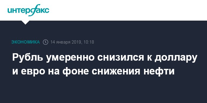 По мнению экспертов "Интерфакс-ЦЭА", умеренное снижение валютного курса рубля в начале торгов 14 января связано, прежде всего, с падением мировых цен на нефть после их активного роста на прошлой неделе. Мартовские фьючерсы на Brent на лондонской бирже ICE Futures к 10:01 по московскому времени подешевели на 1,26% - до $59,72 за баррель. На торгах в пятницу их цена снизилась на 1,95% и составляла на закрытие $60,48 за баррель. Стоимость фьючерса на WTI на февраль на электронной сессии на Нью-йоркской товарной бирже понизилась к этому времени на 1,43% - до $50,85 за баррель. По итогам прошлой сессии их цена опустилась на 1,9%, завершив торги на отметке $51,59 за баррель.