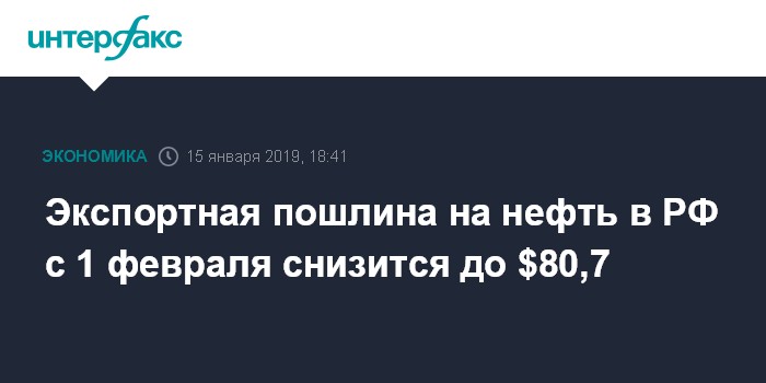 Москва. 15 января. INTERFAX.RU - Экспортная пошлина на нефть в РФ с 1 февраля 2019 года составит $80,7 за тонну, говорится в материалах на сайте Минфина РФ.