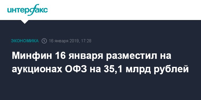 Москва. 16 января. INTERFAX.RU - Министерство финансов России 16 января провело три первичных аукциона по продаже облигаций федерального займа (ОФЗ), в результате которых были размещены все выставленные на продажу бумаги на рекордную с 25 июля сумму - 35,142 млрд рублей по номиналу. Таким образом, дебют ведомства на первичном рынке в 2019 году оказался весьма успешным для эмитента.