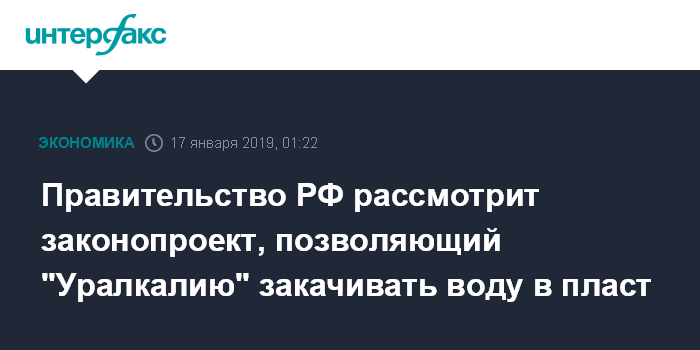 Москва. 17 января. INTERFAX.RU - Правительство РФ в четверг рассмотрит законопроект, разрешающий закачку воды в пласты горных пород при добыче калийных и магниевых солей.