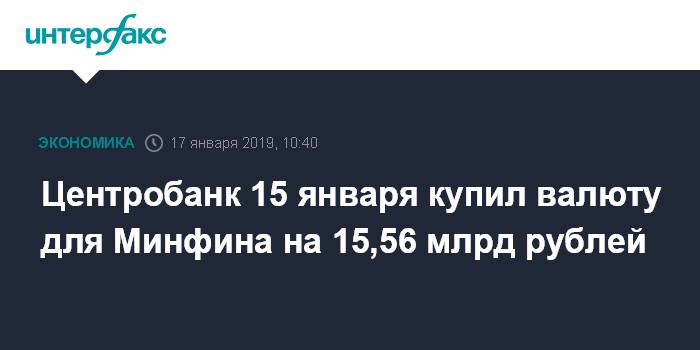 Москва. 17 января. INTERFAX.RU - ЦБ РФ 15 января купил валюту для Минфина в рамках бюджетного правила на 15,56 млрд рублей, следует из данных Банка России.
